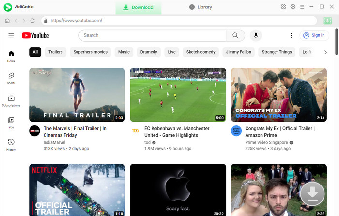 As an all-in-one video downloader, VidiCable Video Downloader offers complimentary downloads of YouTube videos. Through its built-in YouTube browser, VidiCable enables you to seek out videos or access its library as you would do on YouTube, which also means you can download videos from YouTube without the app.
